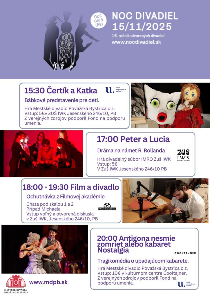 15:30Čertík a Katka – bábkové predstavenie pre deti – (v ZUŠ IWK, Jesenského 246/10 Považská Bystrica) Vstup 5€ 17:00 Peter a Lucia – na námet Romain Rolland: Peter a Lucia (hrajú študenti II°LDO ZUŠ IWK Považská Bystrica) – (v ZUŠ IWK, Jesenského 246/10 Považská Bystrica) Vstup 5€ 18:00-19:30 Film a divadlo – Ochutnávka z filmovej akadémie: Cata pod skalou 1 a 2, Prípad Michalela, otvorená diskusia. Vstup voľný (v ZUŠ IWK) 20:00 Antigona nesmie zomrieť alebo kabaret Nostalgia – autorská tragi-komédia (v kultúrnom centre Cooltajner) Vstup 10€ Zvýhodnené vstupné 10€ na obe predstavenia o 17:00 a 20:00 Rezervácie na email: rezervacie@mdpb.sk